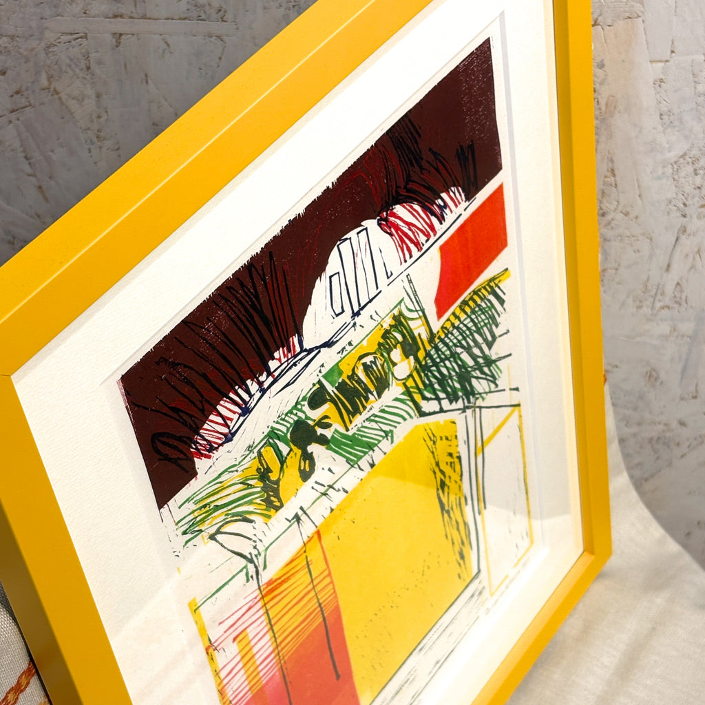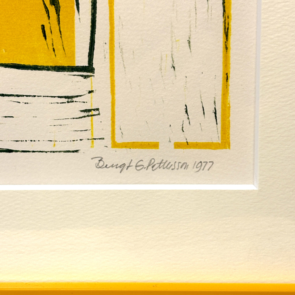 スウェーデンのアーティスト、Bengt G. Petterssonによるリトグラフ作品「The trees and the fields」。ダイナミックな構図と、鮮やかなイエローやレッド、深いグリーンの色使いが印象的で、自然と抽象が融合したエネルギー溢れる一枚です。ポップでモダンなイエローのフレームが作品の魅力をさらに引き立て、空間に明るさとアートのアクセントを加えてくれます。リビングやダイニング、ワークスペースなど、日常に元気をプラスしたい場所におすすめ。北欧らしい感性と独自の表現が光る、洗練されたアートピースです。限定ナンバー入りの一点もの。