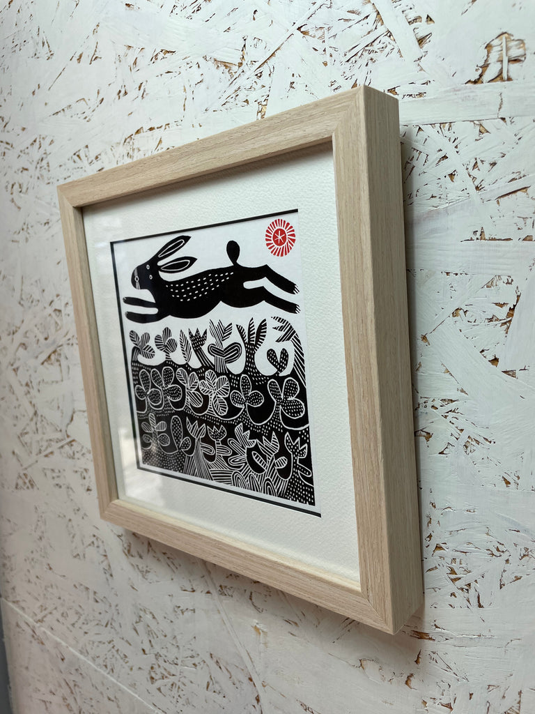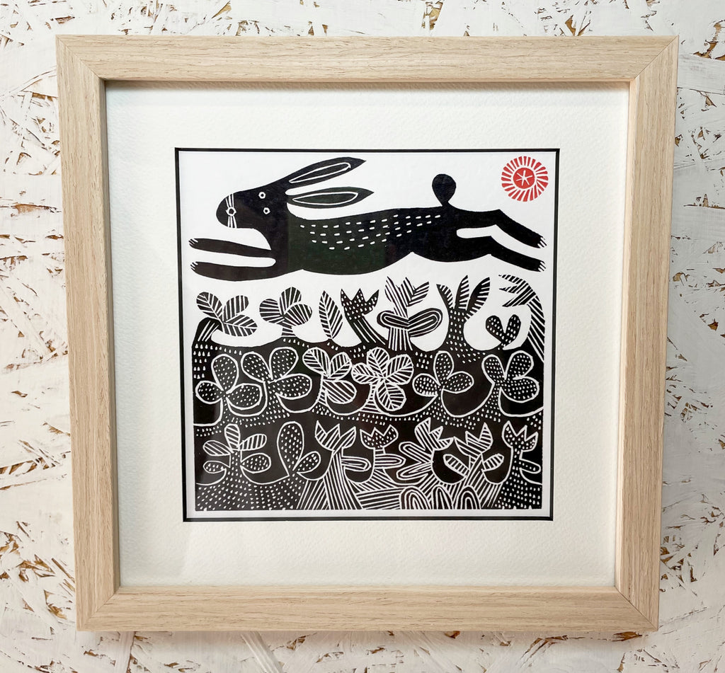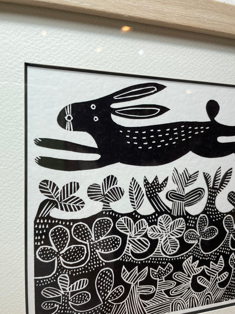 スコットランドのアーティスト、Hilke MacIntyre(ヒルケ・マッキンタイヤ)の版画作品をポスターアートに仕立てたミニアートフレーム「喜びウサギ」。草むらの中を跳ね回るウサギの姿が、大胆な線とリズム感のある構図で描かれ、作品全体から明るく前向きなエネルギーがあふれています。モノトーンの中にぽっと浮かぶ真っ赤な太陽が、印象的なアクセントに。小さなサイズながら存在感があり、壁に飾ると空間がぐっと楽しくなる一枚です。ユーモアと生命力に満ちた、ヒルケらしいアートです。
