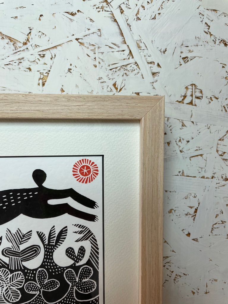 リノカットではなく、プリントされたメッセージカードを額装しました。