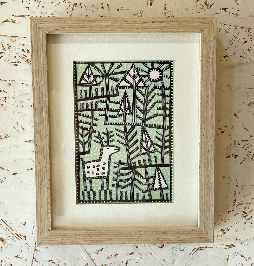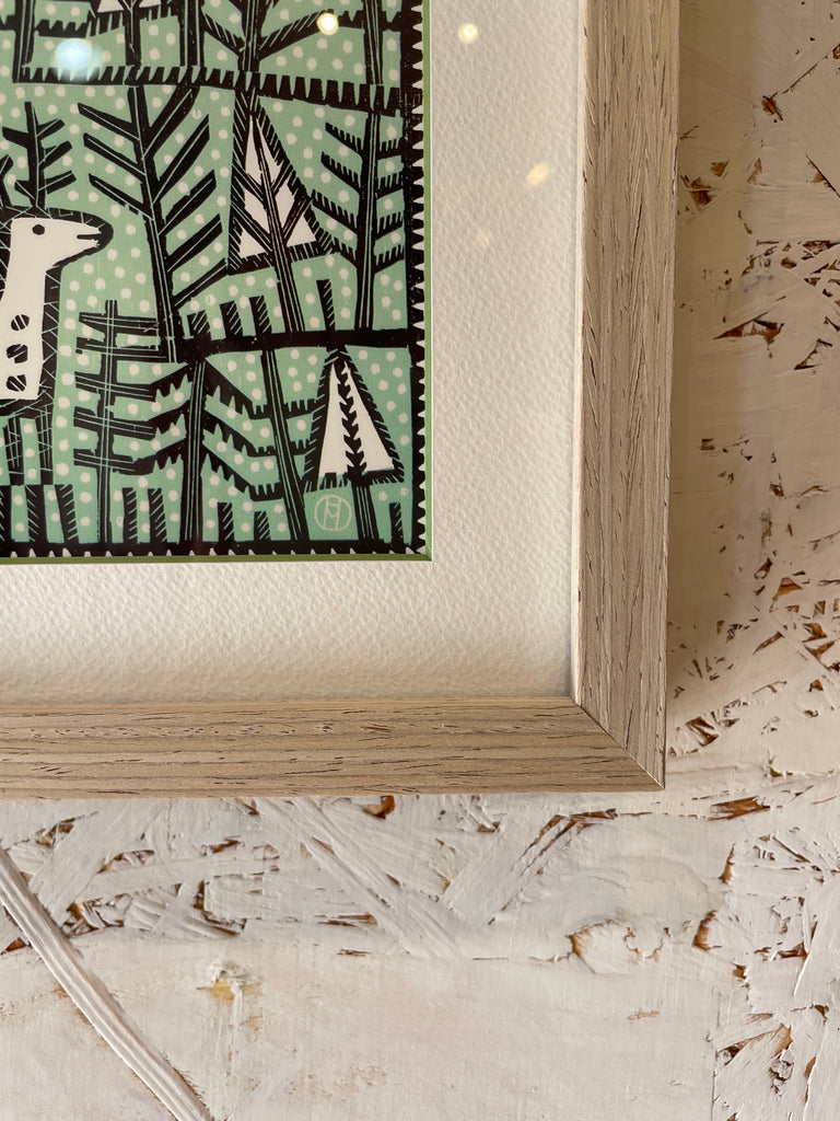 Hilke MacIntyre ヒルケ・マッキンタイヤのリノカット版画作品を元に制作されたポスターカードを額装したミニアートフレーム。