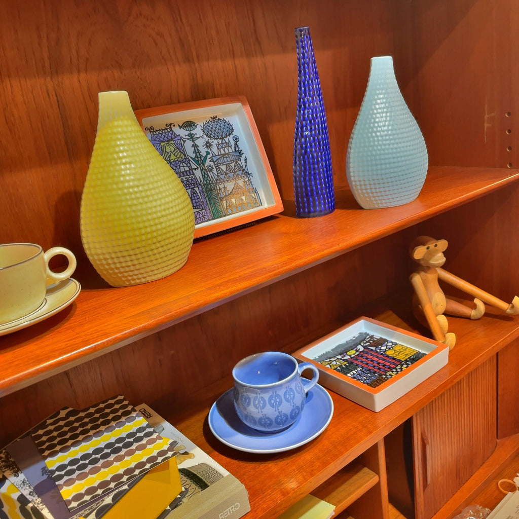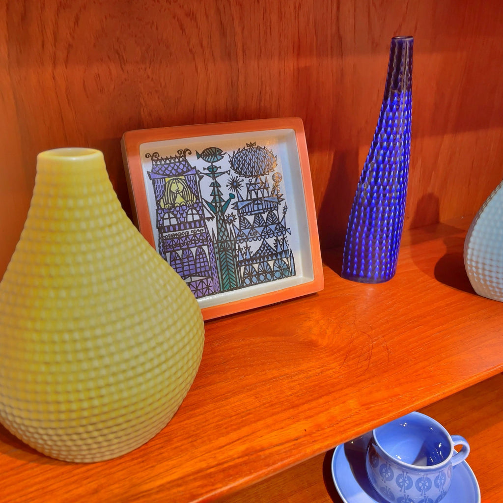 テーブルやキャビネットの上に置いてアートオブジェのように飾れば、まるで小さな美術館の一角のような雰囲気に。シェルフに立て掛けても空間をさりげなく華やかに彩ります。実用のための器という枠を超え、インテリアに豊かな表情を与えるヴィンテージアートピースです。